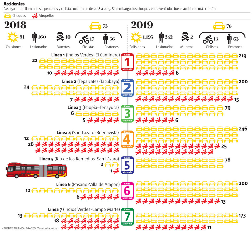 En 2019 las unidades de Metrobús vieron involucradas en 76 atropellamientos de peatones y ciclistas, de los cuales dos perdieron la vida, mientras que en 2018 hubo menos arrollados, 73, pero hubo más decesos, 10.