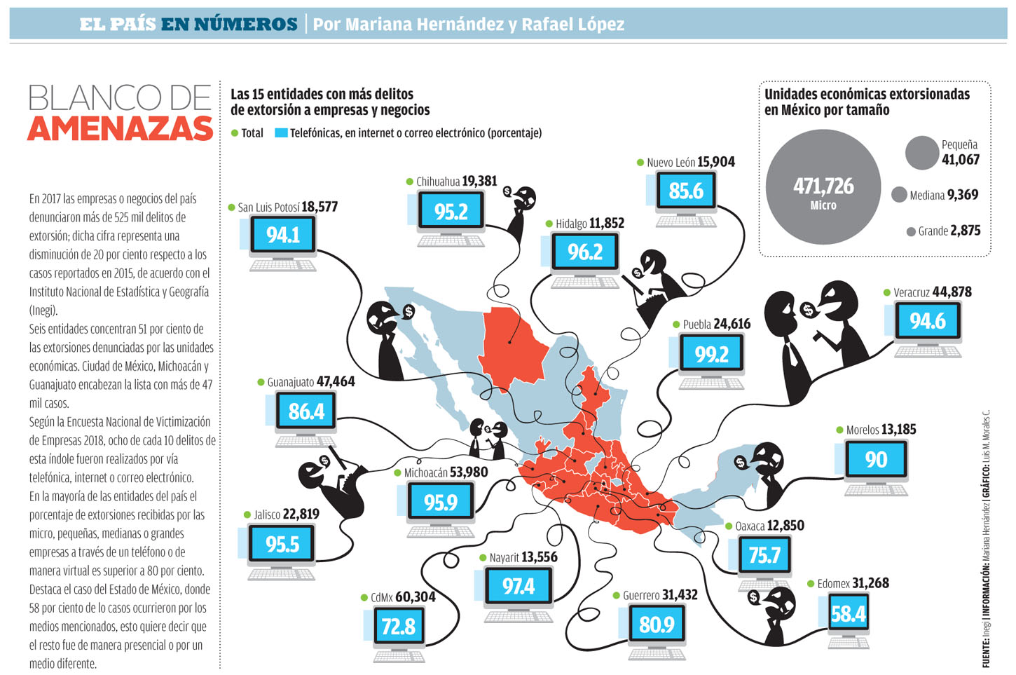 En 2017 las empresas o negocios del país denunciaron más de 525 mil delitos de extorsión; dicha cifra representa una disminución de 20 por ciento respecto a los casos reportados en 2015, de acuerdo con el Instituto Nacional de Estadística y Geografía