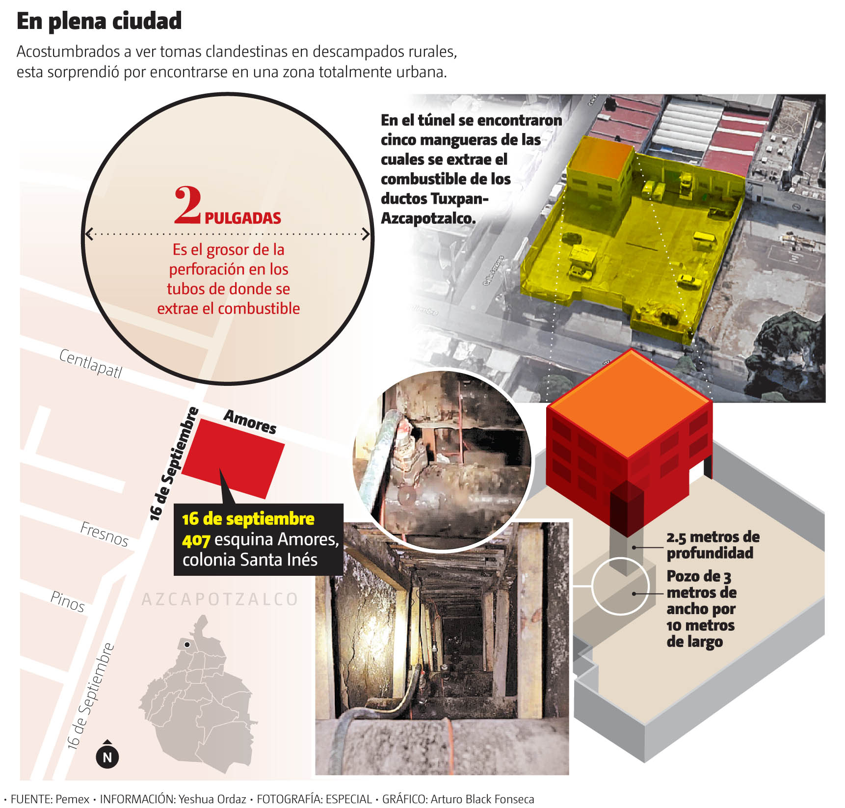 En el inmueble, ubicado en la calle 16 de Septiembre número 407, esquina Amores, colonia Santa Inés, y que está totalmente vacío, hay un anexo de oficinas, donde fue excavado un hoyo que conduce a un túnel en el que se encontraron cinco mangueras que extraen el combustible del ducto Tuxpan-Azcapotzalco, informó personal de Pemex.