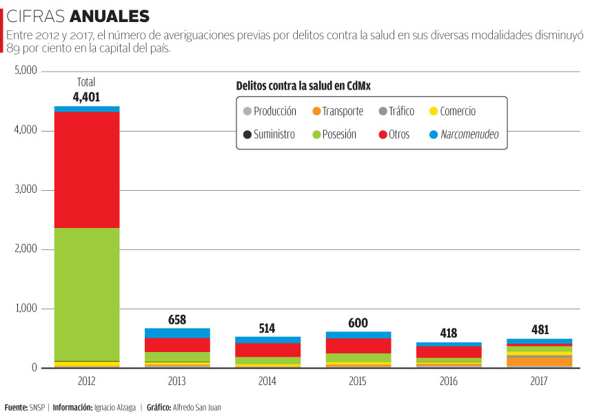 A partir de 2013 la cifra descendió: ese año se integraron 658 averiguaciones previas por delitos contra la salud en sus modalidades de producción, transporte, tráfico, comercio, suministro, posesión y narcomenudeo, entre otros ilícitos que así tipifica la ley.