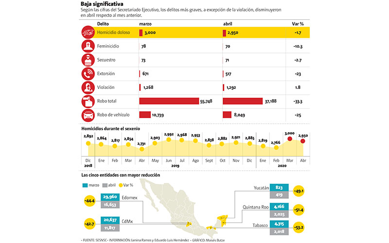 Las cifras del Secretariado muestran una tendencia a la baja en varios delitos; entre los más notorios están los de índole sexual, cuyo récord histórico de 5 mil 239 denuncias impuesto en marzo cayó a 3 mil 172 en abril. Las fiscalías del país contabilizaron el mes pasado 111 mil 547 ilícitos, 57 mil 279 menos que en marzo; la cifra es la más baja desde enero de 2004, cuando se consignaron 108 mil 107 delitos. Hubo 70 feminicidios, una caída de 10.3 por ciento respecto al mes anterior; abril fue el mes con menos víctimas de género durante 2020.