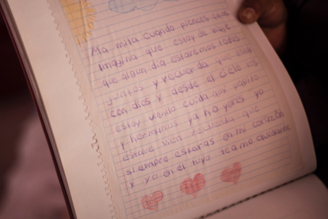Se permite sacar los cuadernos de su hija, mostrar sus tareas, cartas y poemas. La psicóloga les dijo que sus dibujos reflejan a una niña que se supo amada. En un video canta “con zapatos de tacón, las nenas se ven mejor…”. Reviven las ironías. En una ocasión hablaron de la muerte. Lupita le dijo que a ella le tocaría enterrarla. Camila reviró que ella moriría primero. Días después le entregó una inesperada carta de despedida a su madre: le pedía cuidar a su papá e imaginarla de viaje. Camila siempre ganaba.