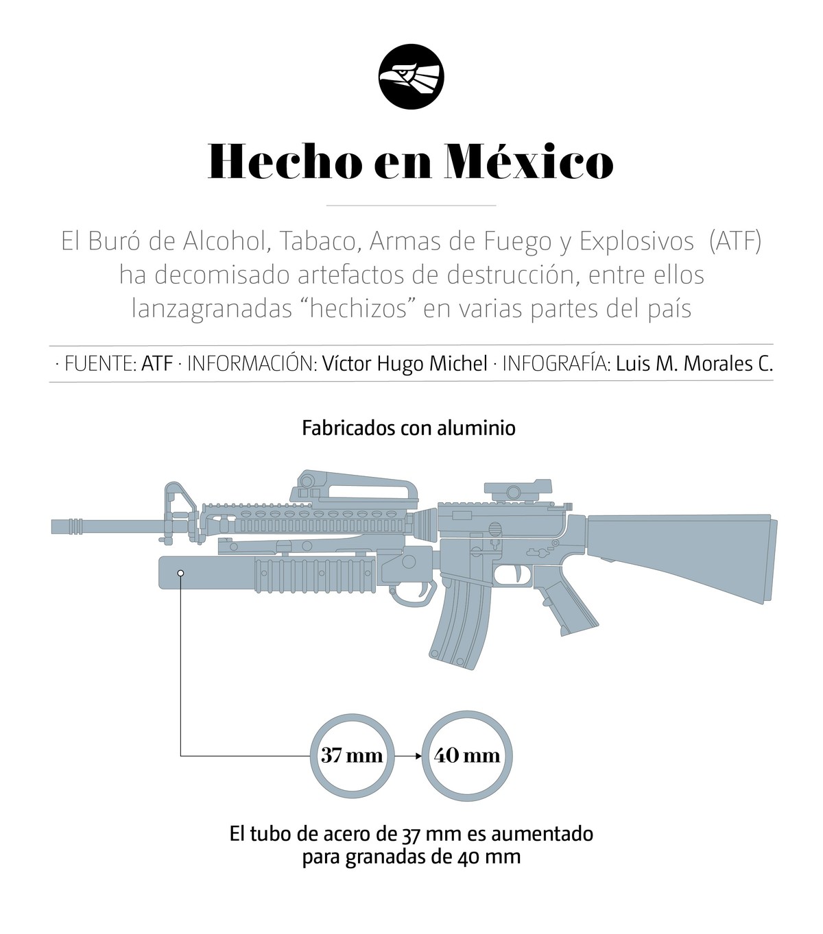 De acuerdo con una nota informativa de la ATF, “un lanzagranadas hechizo es fabricado con aluminio o, en algunos casos, el tubo de acero de 37mm es aumentado para poder albergar granadas de 40mm. En los Estados Unidos, los lanzadores de 37mm son comúnmente utilizados por fuerzas de seguridad para ser empleados con munición menos letal como lo son granadas de gas, humo y bengalas”.