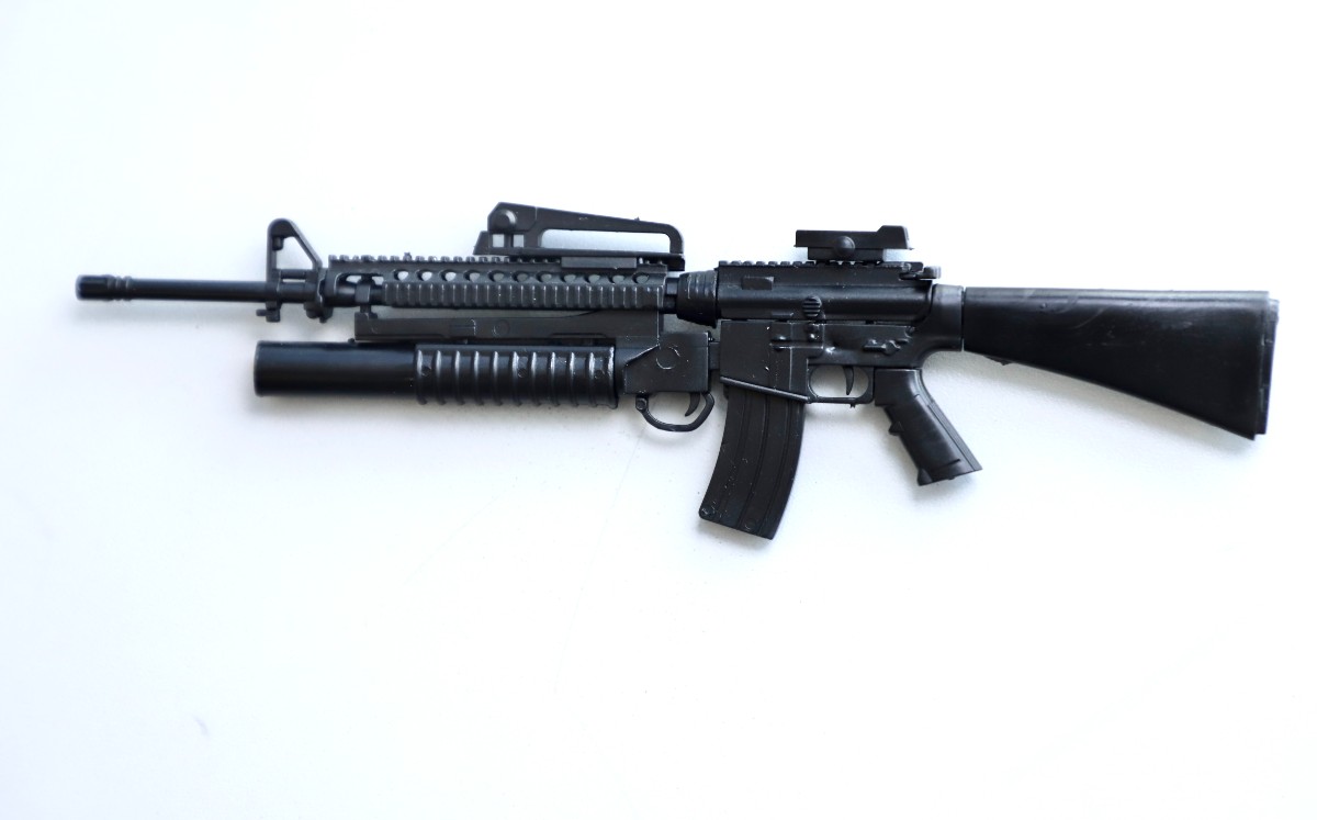 A primera vista, el rifle parece un M162A2 con lanzagranadas incluido. Tiene hasta el sello “Made in USA” y la marca Colt impresos en el dorso, pero aunque este rifle sí puede matar y dispara granadas de 40 milímetros que seguramente harían volar un vehículo blindado, no todo es como parece: en el cañón dice “Launcher Granade” (sic). Está mal escrito en inglés.