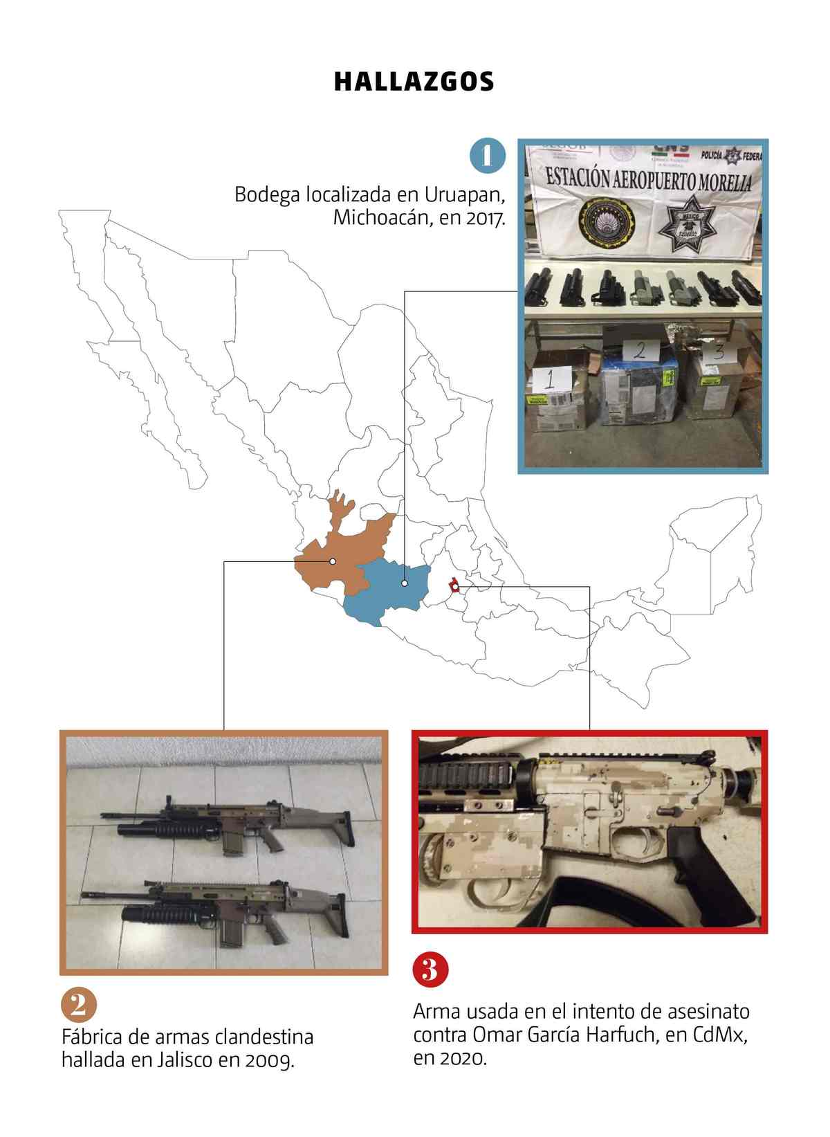 Fuentes de seguridad consultadas por MILENIO detallaron que el primer caso registrado de armas piratas data de 2017, cuando la entonces Policía Federal descubrió en una bodega de DHL en Uruapan, Morelia, un paquete con siete lanzagranadas las cuales se dirigía a Culiacán. Todos eran piratas, con el logotipo de Colt impreso en el dorso.
