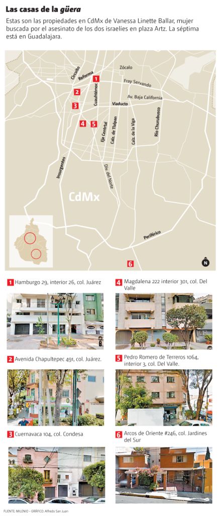 Entre 1998 y 2016, Vanessa Linette Ballar Fallas dio seis domicilios diferentes en Ciudad de México y uno en Guadalajara para contratar diferentes servicios, como telefonía celular. Así se establece en investigaciones de israelíes en México. Se trata de los siguientes inmuebles, todos de clase media.