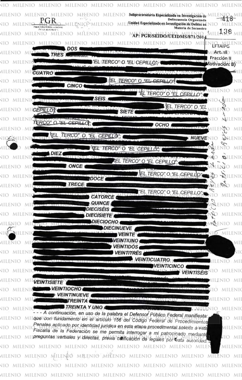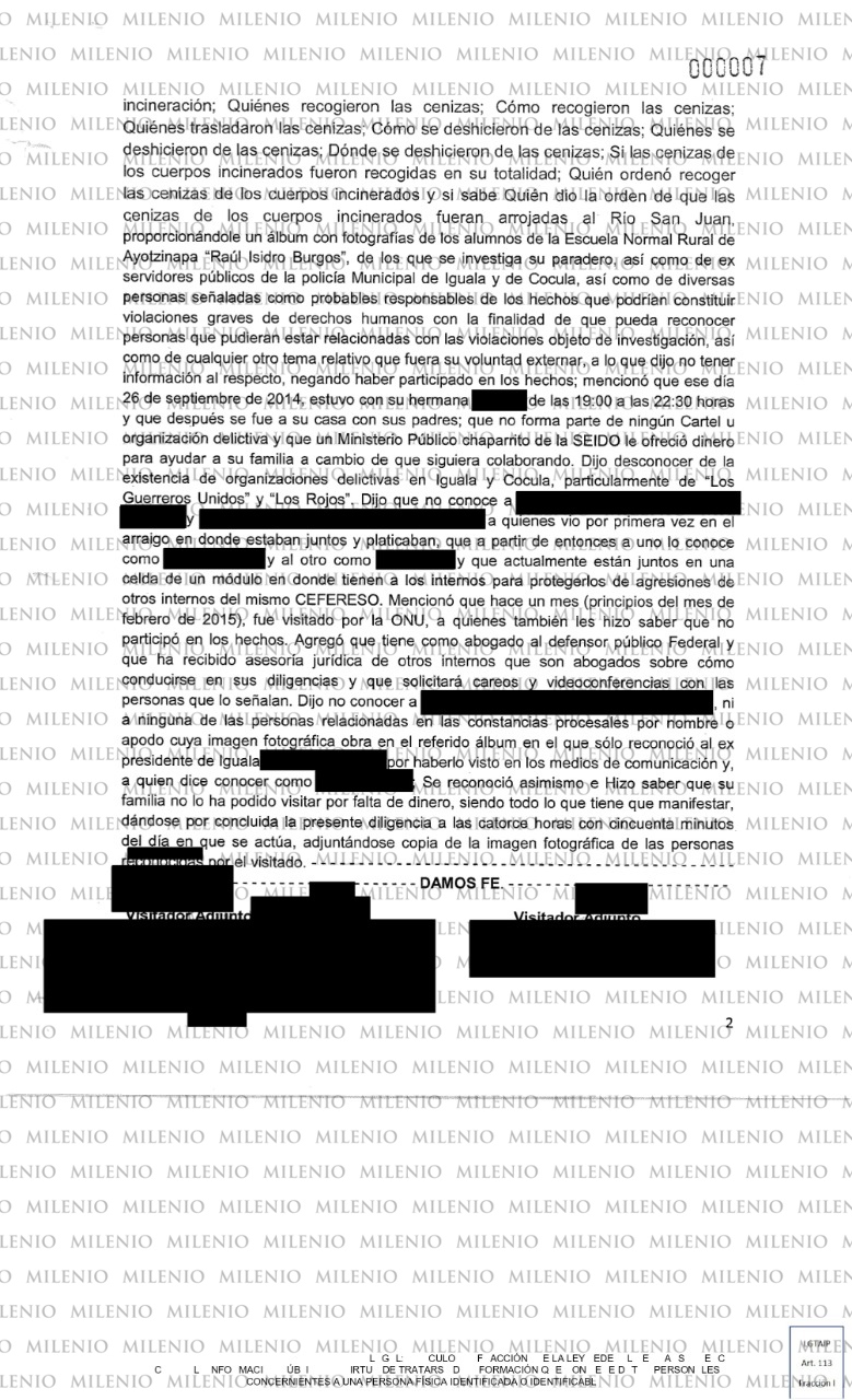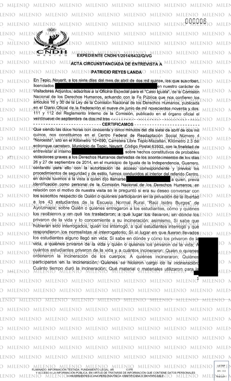 En la entrevista, obtenida por MILENIO a través de solicitudes de transparencia, se detalla que se le preguntó si quería conversar sobre la desaparición de los 43 estudiantes normalistas de Ayotzinapa, pidiéndole precisar quiénes participaron en privarlos de la vida, quiénes los entregaron, quiénes los recibieron, en qué los trasladaron, a qué lugar los llevaron, en dónde los privaron de la vida y lo concerniente a su incineración.