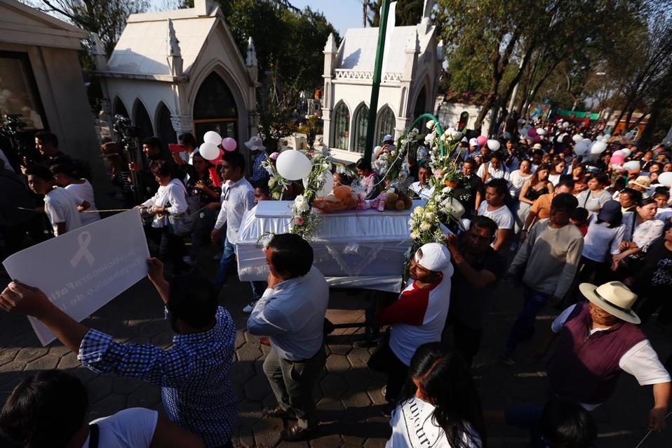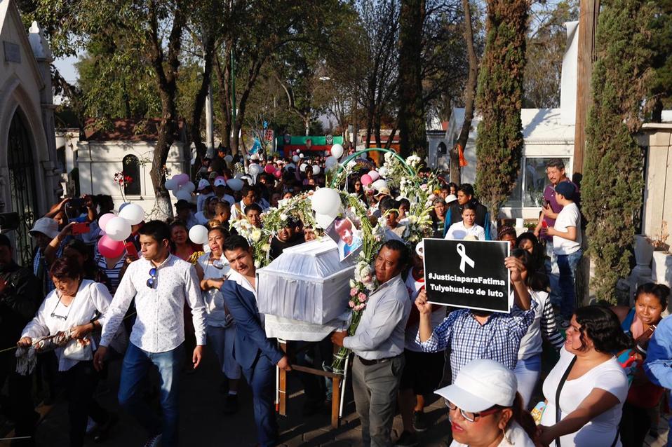 El cuerpo de Fátima Cecilia de siete años, fue despedido por familiares, amigos y vecinos, quienes echaron porras y agitaron pañuelos blancos en medio de aplausos antes de sepultar el ataúd en el panteón municipal de Tulyehualco, en Xochimilco.