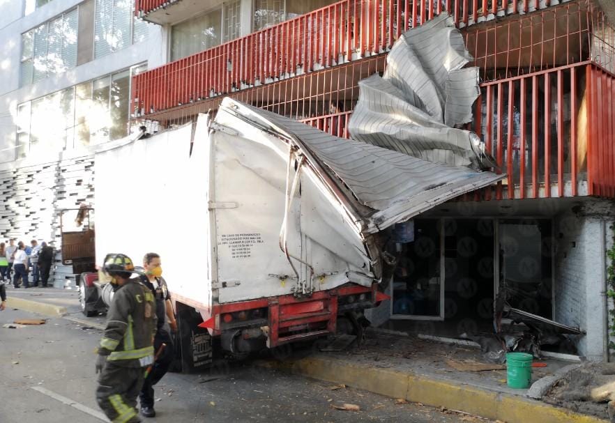 “Estamos esperando una grúa, una vez que se retire el camión se revisará el daño estructural en la fachada”, comentó personal de Protección Civil.