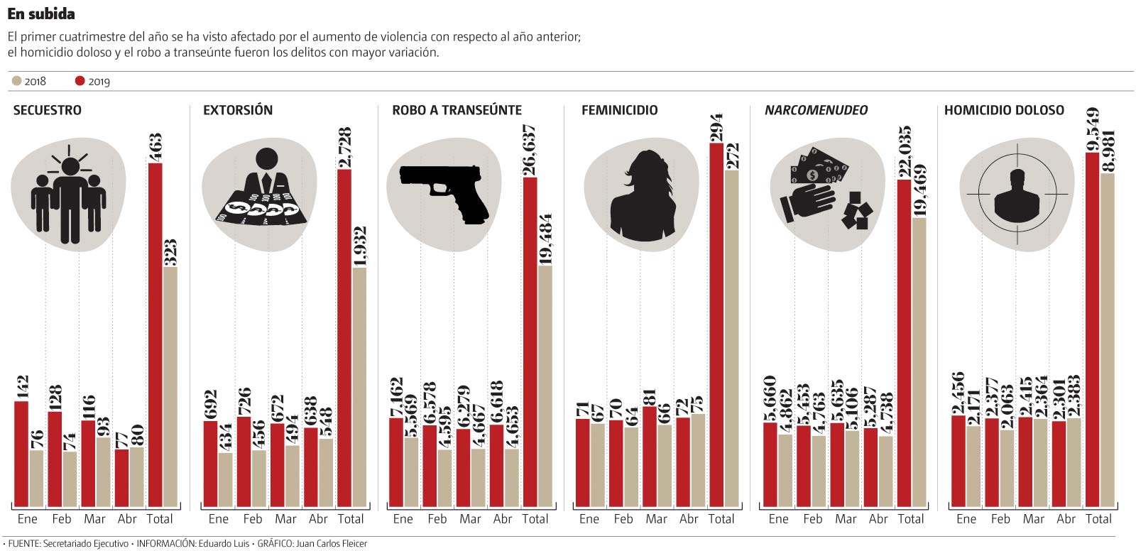 Según las dependencias estatales, de enero a abril de 2019 se cometieron 9 mil 549 homicidios con dolo, cifra superior a los 9 mil 83 que se registraron en 2018 en el mismo periodo, un incremento de 3.48 por ciento.