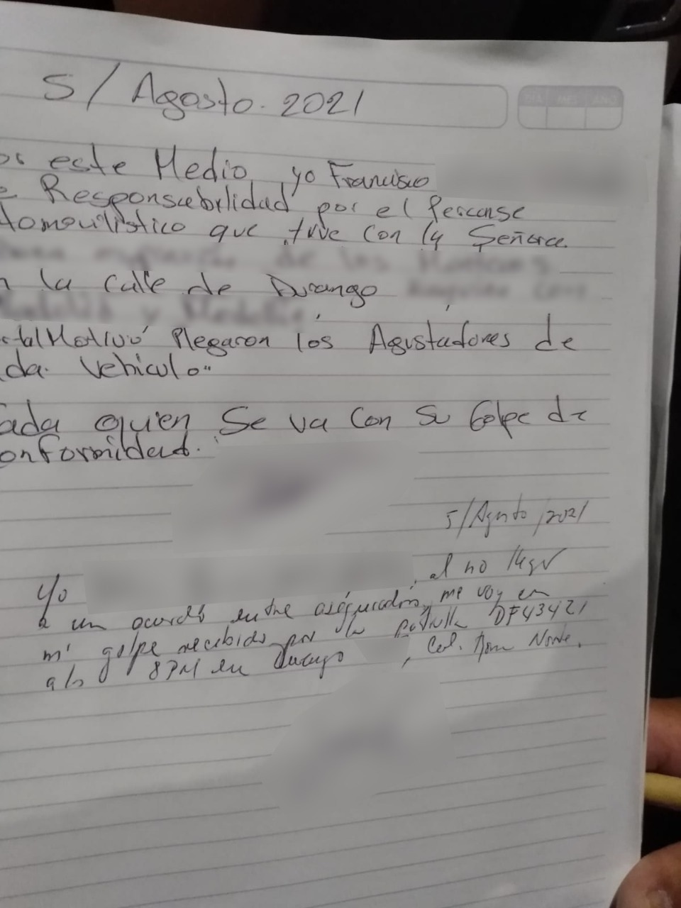 Esperanza estaba a punto de entrar a un restaurante en la calle Durango, colonia Roma. Eran las 20:00 horas del jueves, pero mientras esperaba a que el valet parking se llevara su camioneta, ésta fue golpeada por una patrulla de la Secretaría de Seguridad Ciudadana (SSC) de la Ciudad de México; sin embargo, el policía que la conducía bajó con el arma en mano acompañado de un comandante y se negaron a pagarle el daño ocasionado, haciéndole firmar en una hoja de cuaderno que “cada quien se fuera con su golpe de conformidad”.