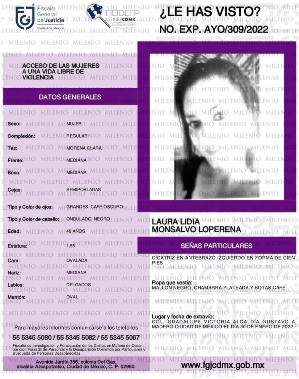 Laura Lidia Monsalvo Loperena, quien trabaja como secretaria de la Jueza Cívico 1 de la Coordinación Territorial GAM-1, fue reportada como desparecida tras no saberse nada de ella desde el 30 de enero luego de salir de su trabajo en la alcaldía Gustavo A. Madero.