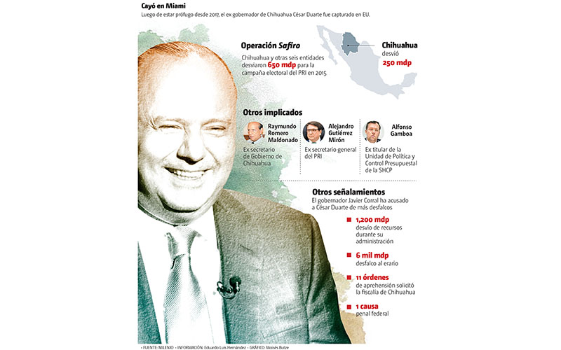 César Duarte, ex gobernador de Chihuahua, fue detenido en Miami, Florida, por elementos del Servicio de Alguaciles Federales (US Marshals Service) con base en una orden de detención con fines de extradición emitida por un magistrado federal de Nuevo México, Estados Unidos.