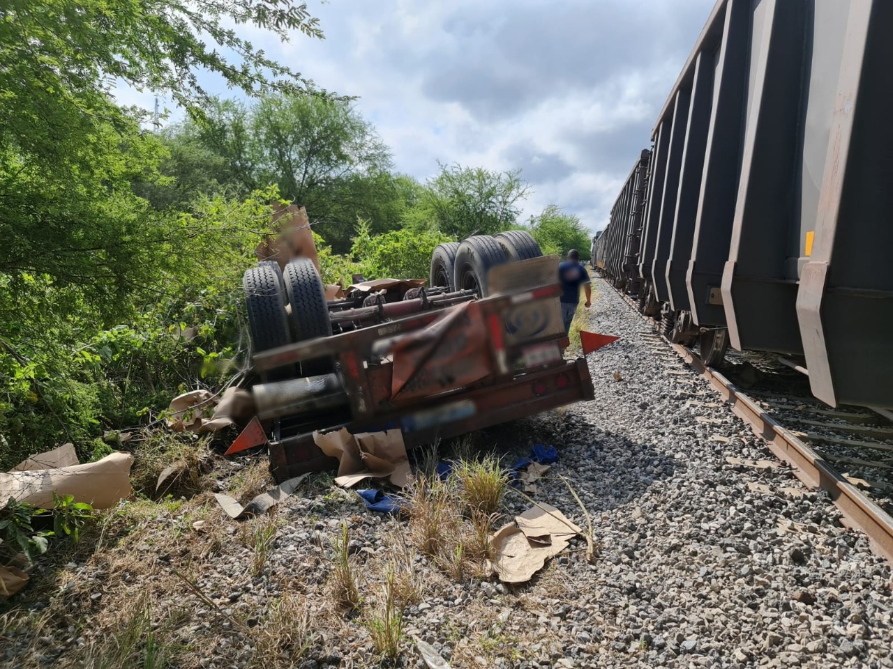 En el kilómetro 49 de la carretera Victoria-Monterrey chocó un tráiler doble remolque contra el tren carguero, impacto que provocó el descarrilamiento de varios vagones y el bloqueo de la carretera en ambos carriles.