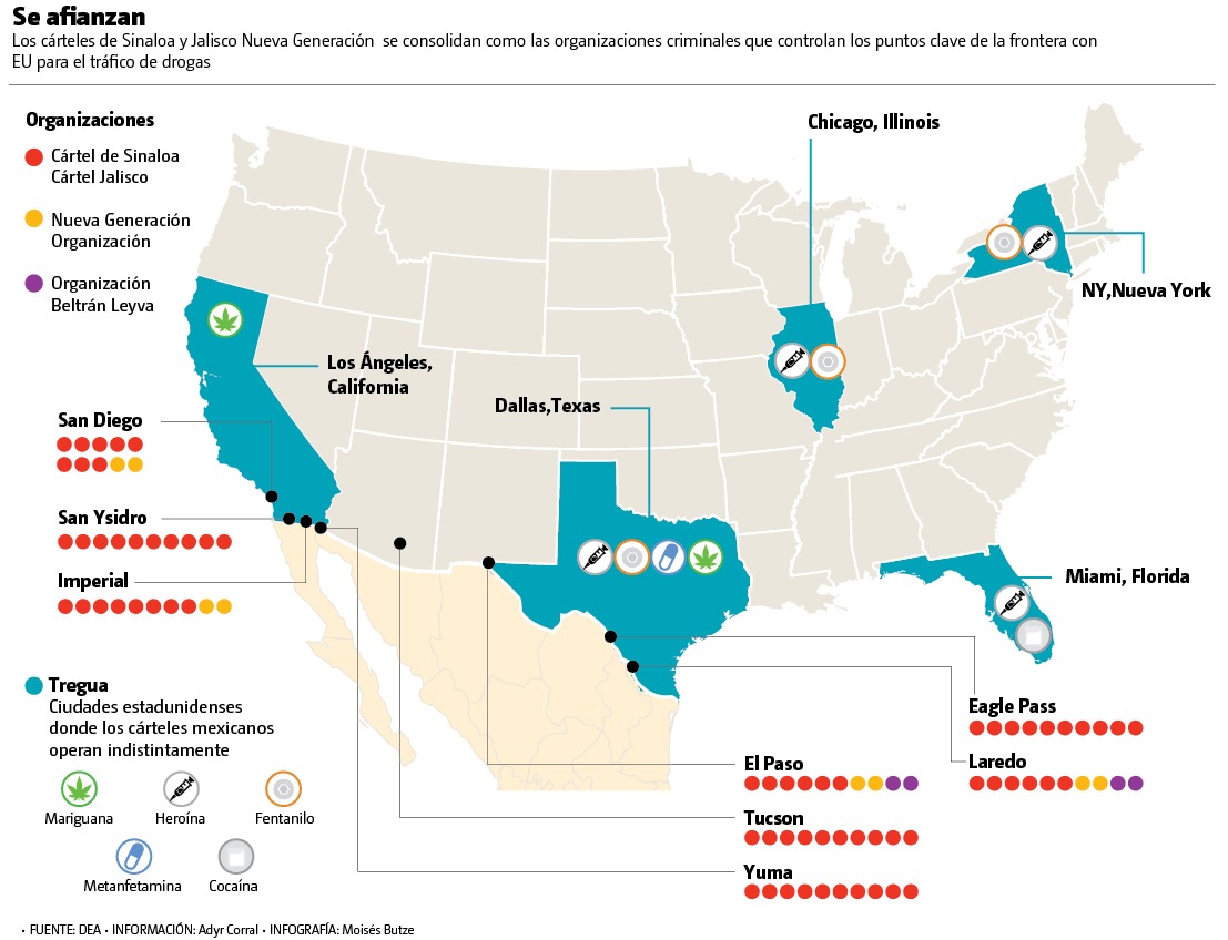 Mientras tanto, del otro lado de la frontera, en ciudades de relevancia histórica, geográfica y cultural como Dallas, Los Ángeles, Chicago, Nueva York, Miami y Phoenix los cárteles mexicanos parecen tener una tregua, pues operan indistintamente organizaciones como el cártel de Sinaloa, el CJNG, los Beltrán Leyva y el Cártel del Golfo.