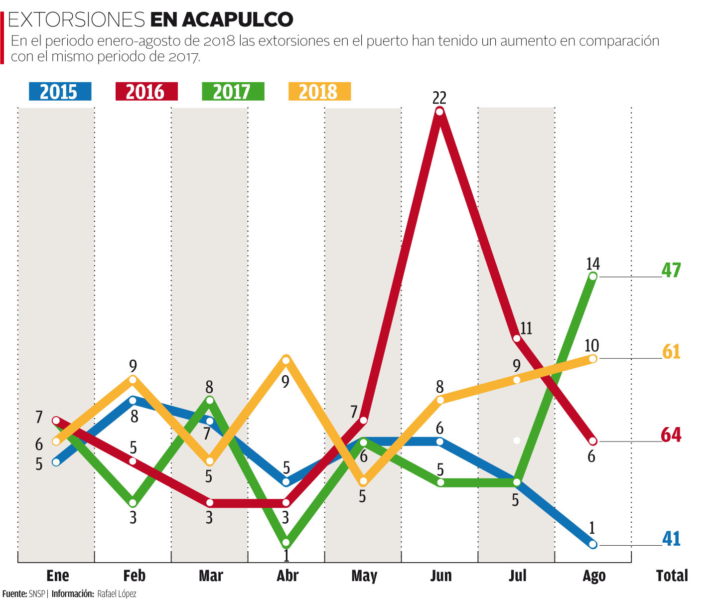 Según el secretariado ejecutivo del Sistema Nacional de Seguridad Pública, la extorsión tuvo su pico más alto en 2016 cuando pasó de 57 casos en 2015 a 92 al año siguiente. En 2017, cayó a 73 reportes ante las autoridades federales y hasta agosto de este año hay 61 denuncias.