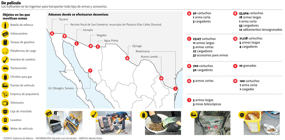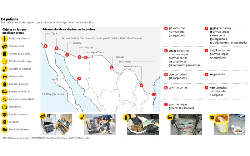 Lavadoras, televisiones, videocaseteras, cilindros de gas, botellas de refresco y hasta cajas de chocolate en polvo usan las bandas del crimen organizado para pasar armas, cartuchos y cargadores de manera ilegal de Estados Unidos a México.