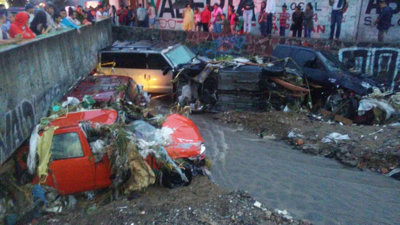 • 20 vehículos fueron arrastrados por la corriente quedando varados dentro la misma.