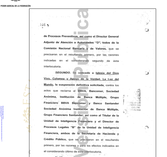 Esto significa que las cuentas bancarias de la organización de la Luz del Mundo se pueden desbloquear y pueden disponer de sus recursos. La suspensión definitiva aplicará en nueve cuentas bancarias que se encuentran en BBVA Bancomer y Grupo Financiero Santander.