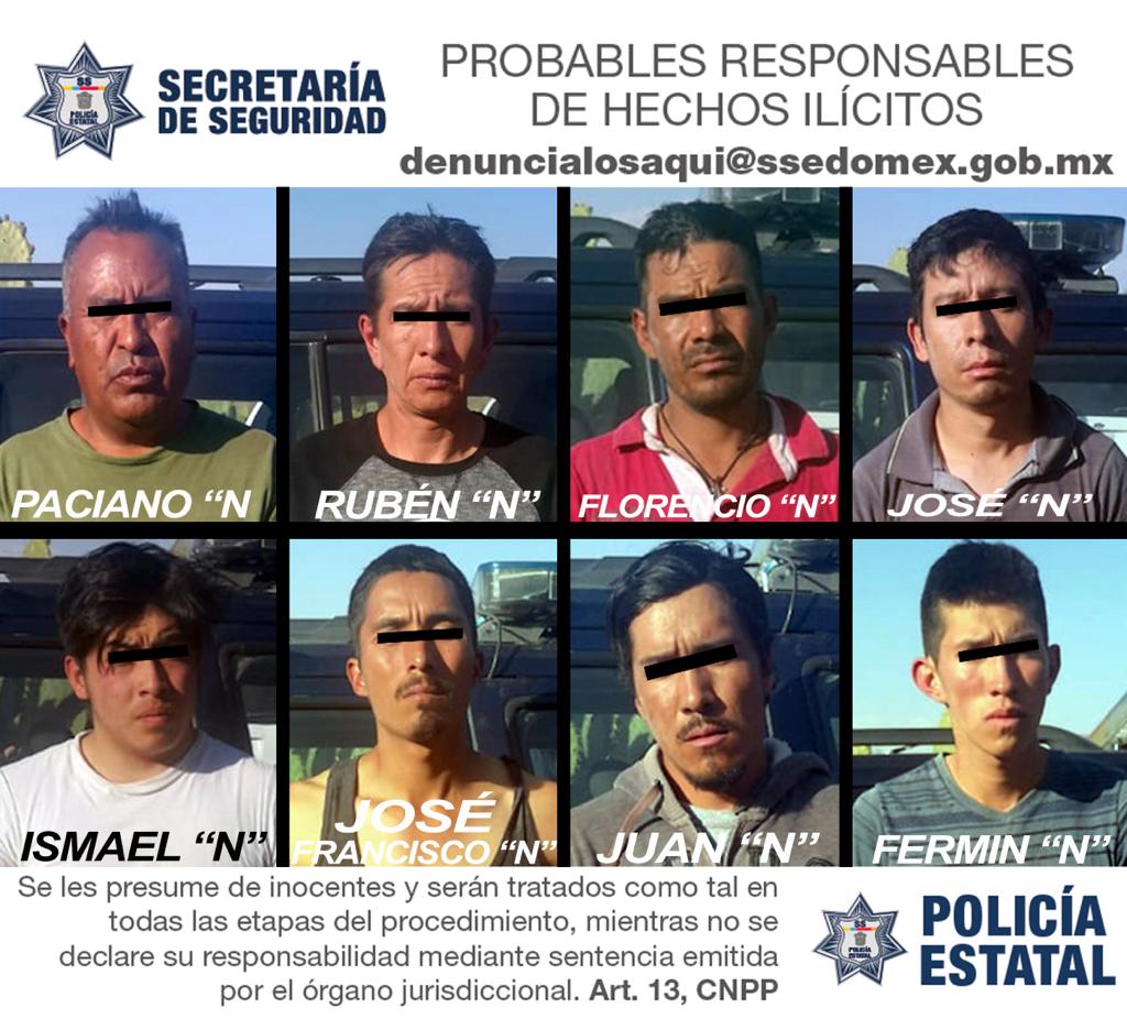 Los detenidos son Paciano “N”, de 46 años; Rubén “N”, 40 años; Florencio “N”, de 38 años; José Enrique “N”, de 34 años; Ismael “N”, 18 años; José Francisco “N”, de 28 años; Juan “N”, de 26 años, y Fermín “N”, de 19 años de edad, todos originarios del estado de Tlaxcala.