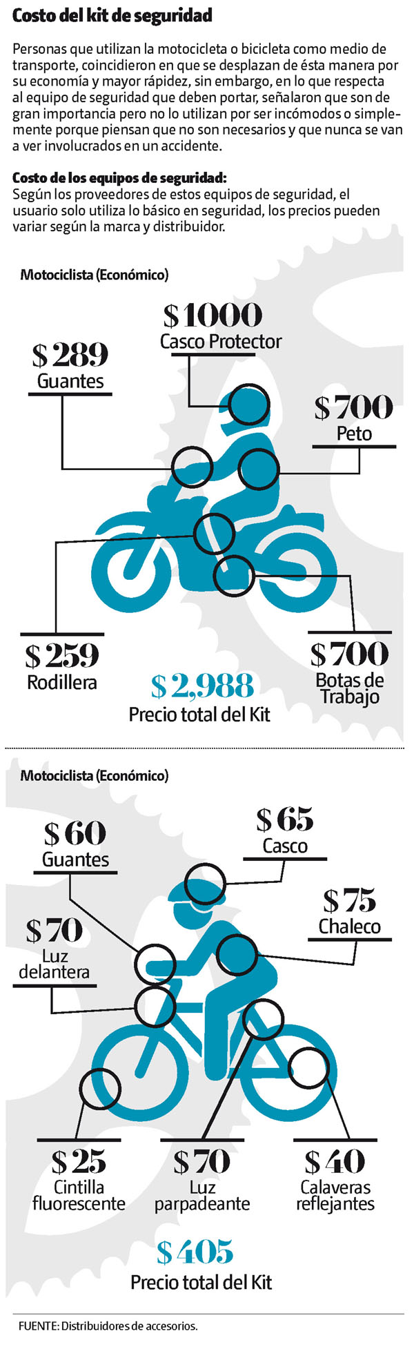 Respecto al equipo de seguridad que deben portar, señalaron que son de gran importancia pero no lo utilizan por ser incómodos o simplemente porque piensan que no son necesarios y que nunca se van a ver involucrados en un accidente, lo que es del todo irreal, ya que a diario se exponen al peligro y aún así no lo compran pese a ser de un precio que oscila entre 405 pesos para ciclistas mientras que del motociclista se les pide cuando menos el casco protector.
