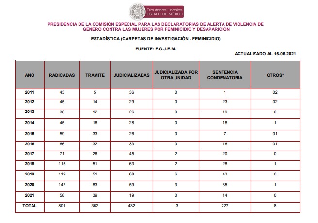 La legisladora destacó que de los 801 feminicidios denunciados sólo 227 han terminado con sentencia condenatoria, no obstante que se han judicializado 432 casos del 2011 a este 2021. Hoy siguen vigentes 362 investigaciones donde no se ha logrado dar con el o los responsables.