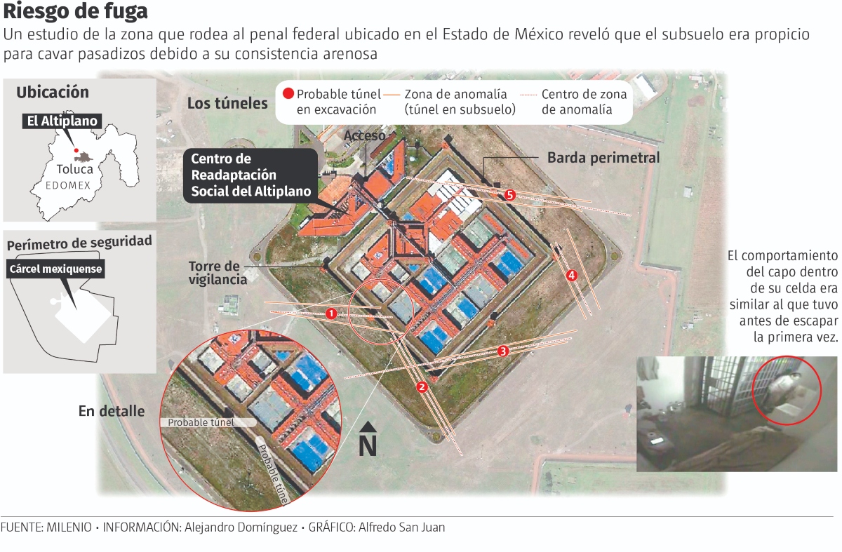 En un estudio del suelo del penal del Altiplano, en poder de MILENIO, se identificaron al menos cinco indicios de túneles. Uno de ellos generó preocupación en las autoridades penitenciarias, que se vieron obligadas a cambiar al capo del narcotráfico a otro penal federal, el de Ciudad Juárez.