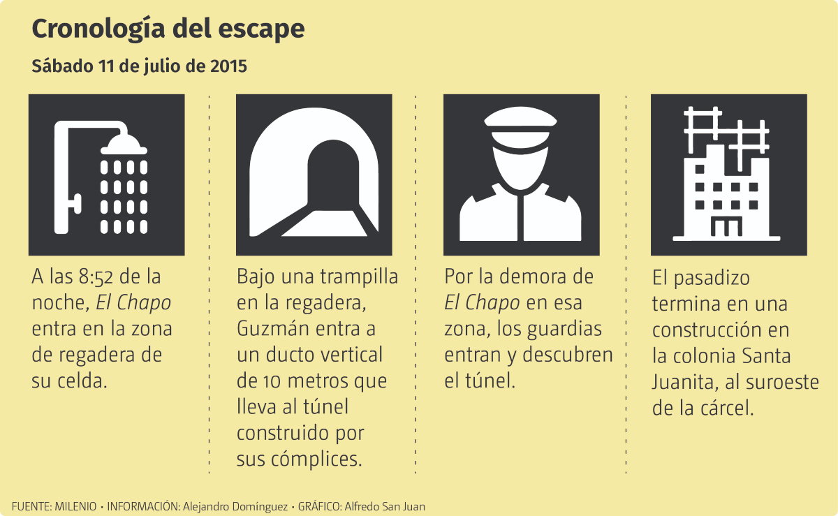 En 2015, el narcotraficante escapó por un túnel de la prisión del Altiplano, esta vez usando un túnel de más de 1.6 kilómetros de largo que comenzaba en el baño de su celda. De acuerdo con el estudio del suelo en poder de MILENIO, el nuevo túnel que alertó a las autoridades se construyó presumiblemente de manera perpendicular, en dirección a una Telesecundaria de la zona.