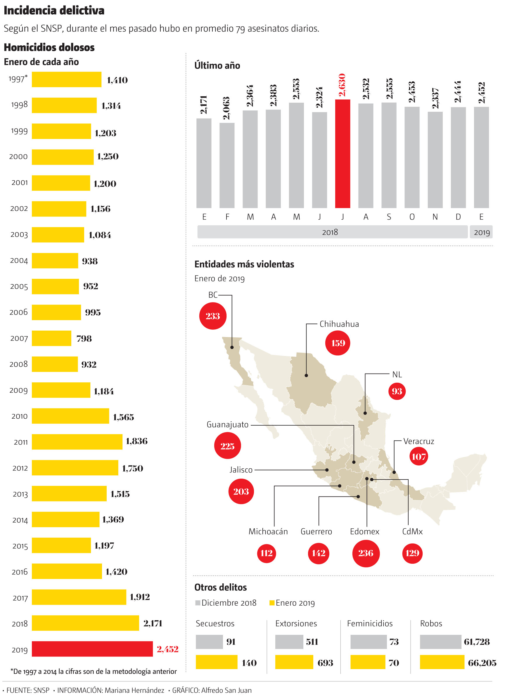 Con 2 mil 452 homicidios dolosos, el mes pasado rompió un nuevo récord convirtiéndose en el enero más violento de la historia, de acuerdo con las cifras del Secretariado Ejecutivo del Sistema Nacional de Seguridad Pública (SNSP).
