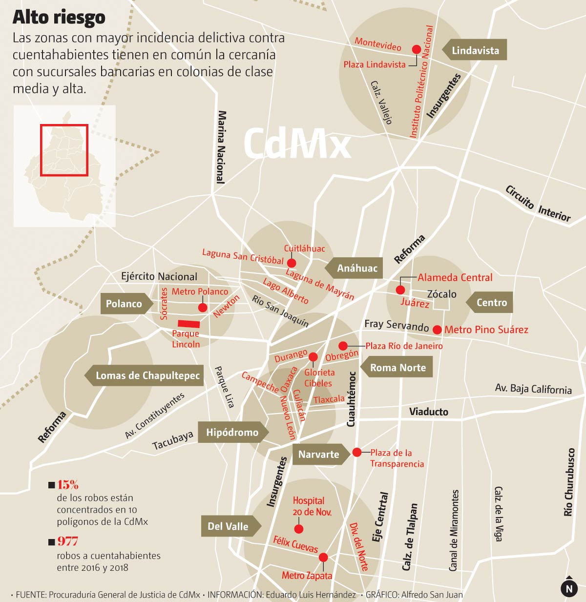 En la colonia Anáhuac hubo 16 denuncias que se ubicaron en las calles Lago Alberto, Cuitláhuac, Laguna de Mayrán, Laguna San Cristóbal y Marina Nacional con sucursales cercanas de los bancos Santander, Scotiabank, Banorte y Bancomer. Mientras que en la colonia Hipódromo, los ilícitos están focalizados en las calles de Nuevo León, Campeche, Tlaxcala y Culiacán con Bancomer y HSBC cerca.