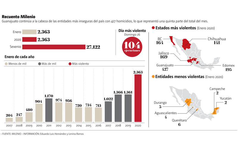 Enero cerró con 2 mil 363 homicidios relacionados al crimen organizado, una cifra menor en 3.2 por ciento a la de diciembre de 2019, cuando el recuento MILENIO registró 2 mil 440 casos.
