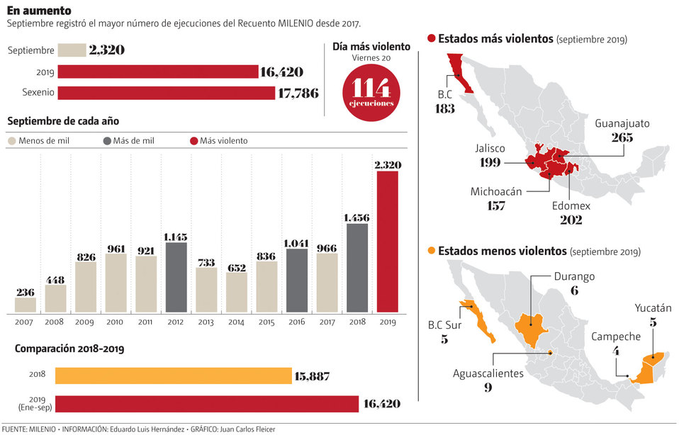 Con los 2 mil 320 homicidios dolosos relacionados con el crimen organizado que se registraron en septiembre, el total de ejecuciones en lo que va del año ascendió a 16 mil 420, cifra que rebasa los asesinatos de todo 2018 cuando sumó 15 mil 887 casos, según el Recuento MILENIO.