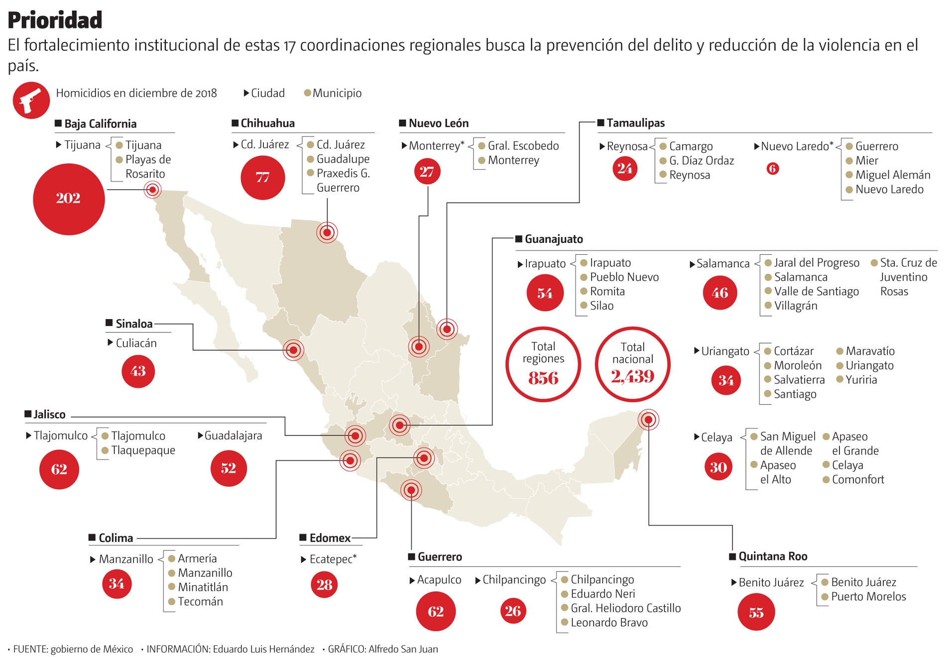 Detalló que, en diciembre, en estas regiones se registraron: 202 homicidios en Tijuana, 77 en Juárez, 62 en Acapulco, 62 en Atlacomulco, 55 en Benito Juárez, 54 en Irapuato, 52 en Guadalajara, 46 en Salamanca, 43 en Culiacán, 34 en Manzanillo, 34 en Uriangato, 30 en Celaya, 28 en Ecatepec, 27 en Monterrey y en Chilpancingo 26. Adicional a estos puntos se sumarán Nuevo Laredo y Reynosa.