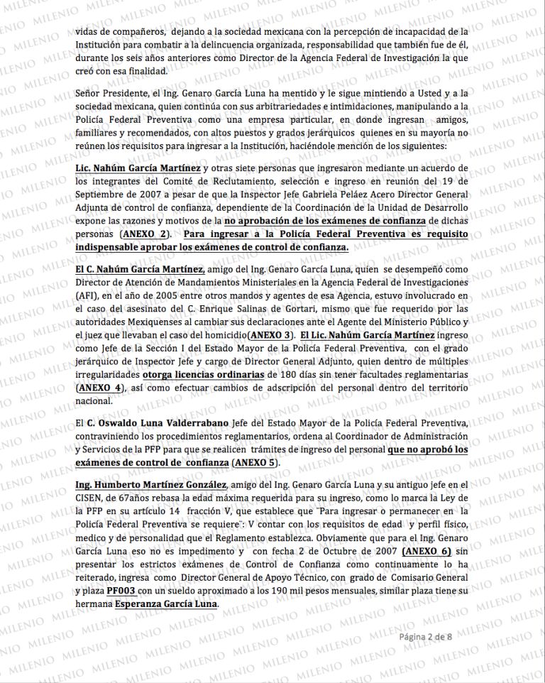 En la carta de mayo de 2008, que el entonces coordinador de seguridad regional de la Policía Federal, Javier Herrera Valles, entregó al presidente Felipe Calderón acusó a Genaro García Luna de cometer arbitrariedades e intimidaciones en la Secretaría de Seguridad Pública y enlistó, con nombres y apellidos, al personal que a pesar de tener cuestionamientos o no aprobar exámenes de control de confianza, García Luna colocó en la dependencia.