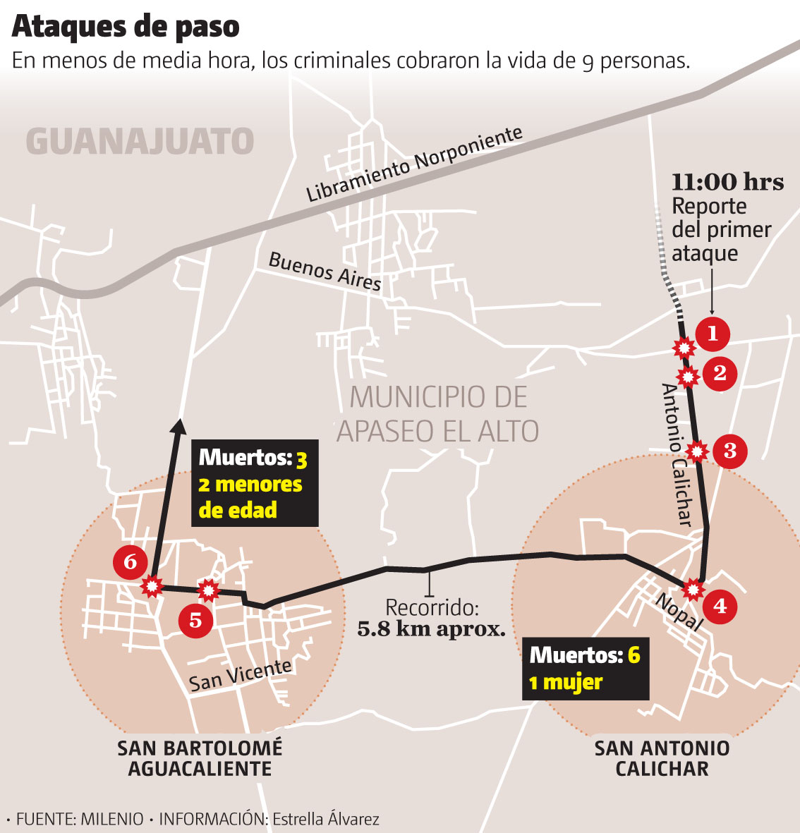 De acuerdo con las primeras versiones de los hechos en Apaseo el Alto, alrededor de las 11 de la mañana se recibió un reporte de que personas armadas habían ingresado en varias camionetas por la carretera libre Querétaro-Celaya a la comunidad de San Antonio Calichar y comenzaron a disparar contra quienes se atravesaban por su camino.