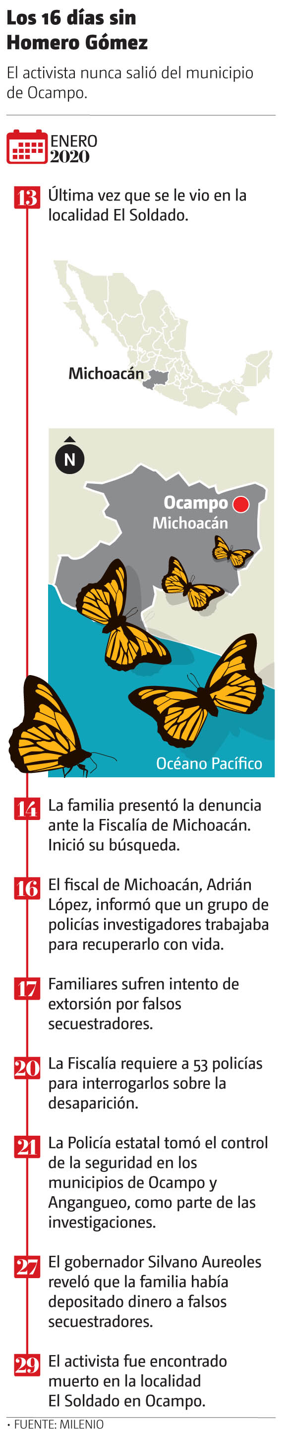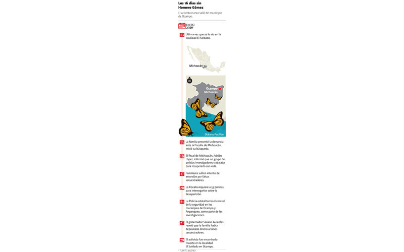 La Fiscalía General de Michoacán informó que fue localizado el cadáver de Homero Gómez González, activista y protector de la mariposa Monarca en el estado, quien fue reportado como desaparecido por su familia desde el 13 de enero.