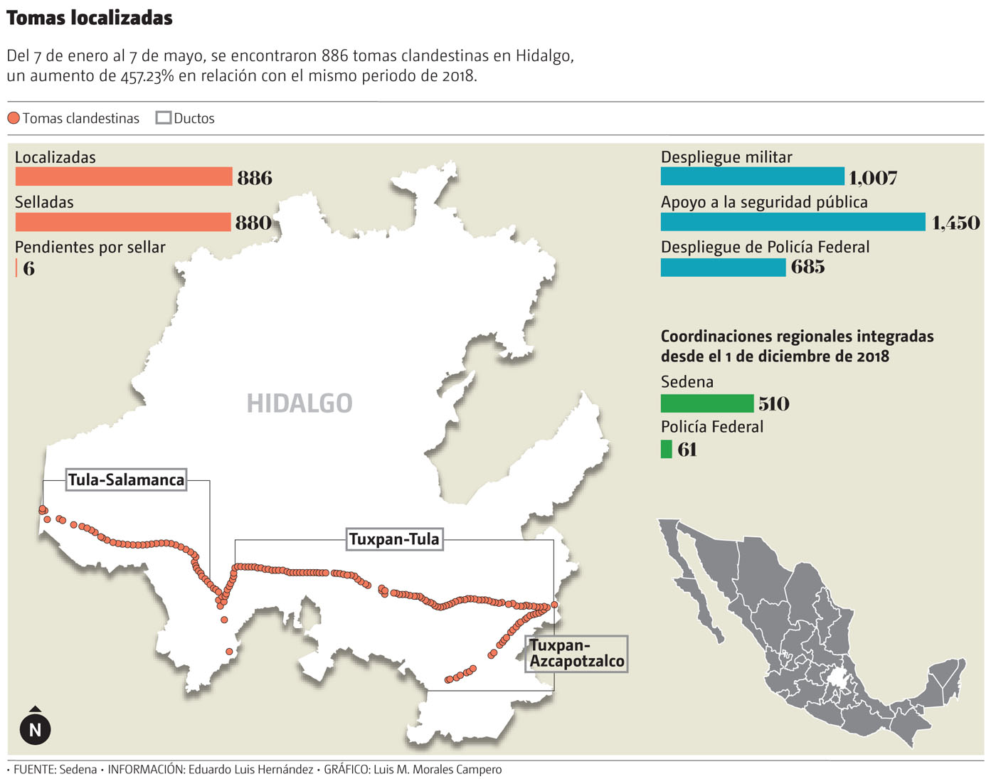 Explicó que por el momento hay 3 mil 142 elementos del Ejército, la Marina y la Policía Federal desplegados en Hidalgo, pero concentrados principalmente en realizar patrullajes en los 45 municipios con mayor robo de combustible o en donde existe “mayor socialización del delito”.