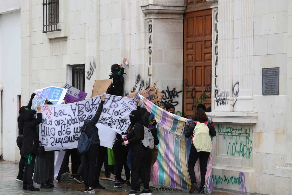 Y así, en la Basílica Menor La Villita, también se manifestaron y las consignas contra feminicidios: "saquen sus rosarios de nuestros ovarios", "pedófilos violadores", "muerte al violador", quedaron plasmadas en la puerta principal y en las paredes de este lugar.