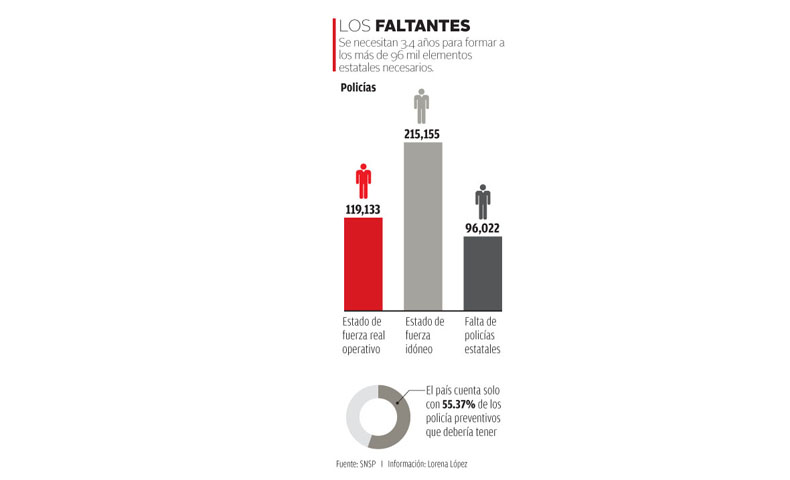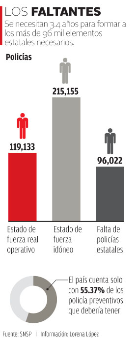 De acuerdo con el SNSP, el estado de fuerza real operativo de las policías estatales asciende a 119 mil 133 elementos, lo cual indica que para alcanzar el estándar ideal de 1.8 policías por cada mil habitantes se necesitan 96 mil 22 nuevos elementos y calcula que son necesarios 3.4 años para formar a más policías.