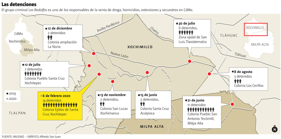 La Fiscalía General de Justicia capitalina indaga una red de policías de la Secretaría de Seguridad Ciudadana (SSC) que presuntamente brinda protección a Los Rodolfos, organización criminal que controla más de 200 puntos fijos de narcomenudeo tan solo en las alcaldías Xochimilco y Milpa Alta, pero que también opera en Tlalpan y Tláhuac.