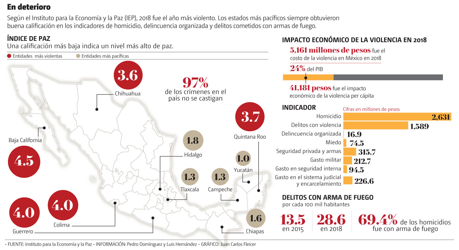 De acuerdo con el “Índice de paz, México 2019” el costo de la violencia equivale a 24 por ciento del Producto Interno Bruto del país y un impacto per cápita de 41 mil 181 pesos, es decir, más de cinco veces el salario mensual promedio de un trabajador.