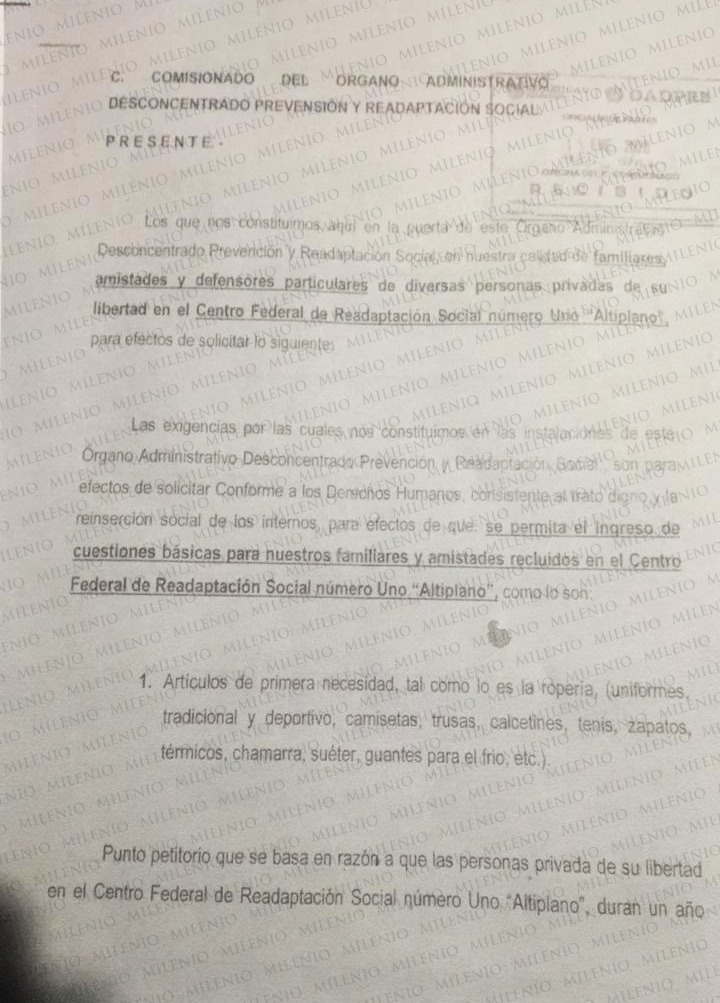 Lo anterior está plasmado en un escrito enviado al comisionado del Órgano Administrativo Desconcentrado Prevención y Readaptación Social (OADPRS), donde también solicitan que se permita usar reloj a los internos, ya que se encuentran encerrados en sus celdas 22 horas al día, perdiendo la noción del tiempo, lo que afecta su estado emocional y psicológico.