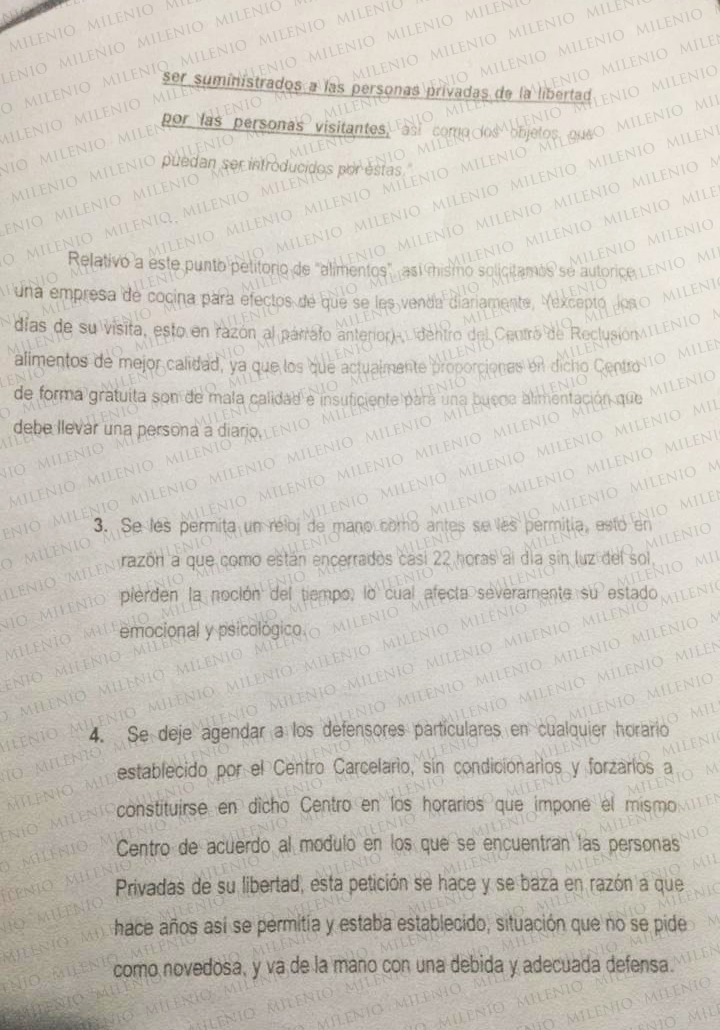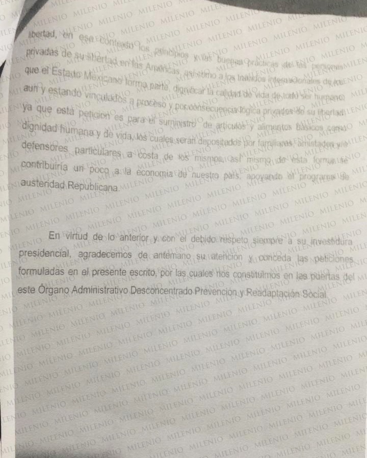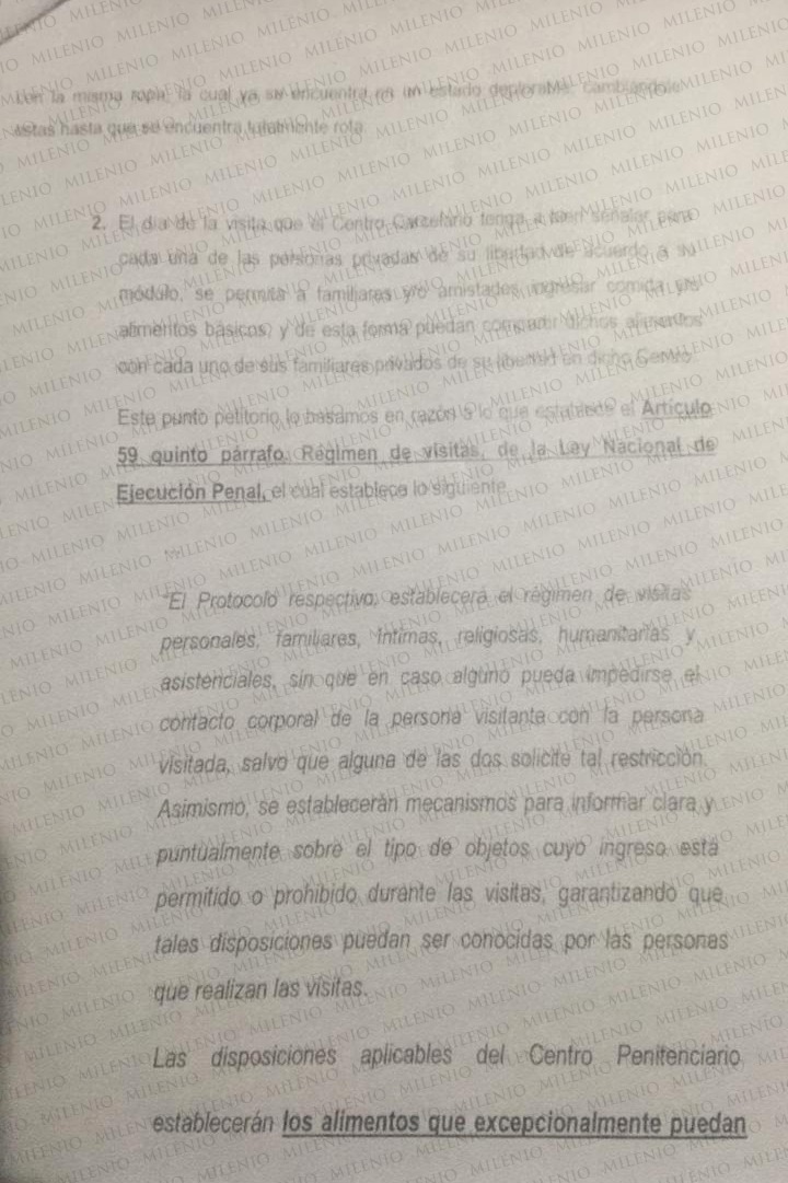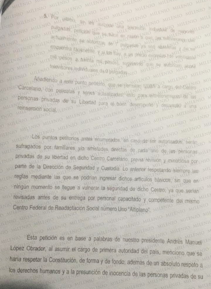Asimismo, pidieron que durante los días de visita se permita a familiares o amistades "ingresar comida o alimentos básicos", para compartirlos con sus parientes, además de que se les autorice una televisión individual de más de 7 pulgadas, que son las permitidas por las autoridades, pero son obsoletas y ya "no se encuentran fácilmente".