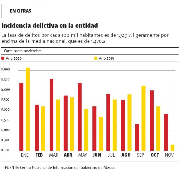 En una gráfica, se aprecia que en el onceavo mes de 2018 se contaron 12 mil 847 delitos en el estado, mientras que en noviembre del año pasado la cifra alcanzó 11 mil 231, la más baja reportada en 2019.