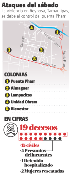 Los ataques del sábado en Reynosa, Tamaulipas, donde murieron 15 civiles y cuatro pistoleros, son parte de una guerra entre bandas criminales por el control de las colonias aledañas al Puente de las Mariposas, que conecta con Pharr, Texas, y es estratégico para el cruce de droga, armas y migrantes, informaron autoridades de seguridad y el procurador de esa entidad, Irving Barrios.