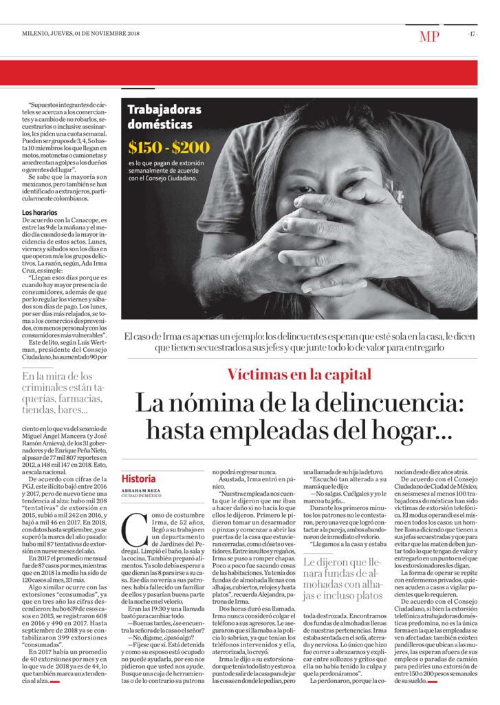 De acuerdo con el Consejo Ciudadano de Ciudad de México, en seis meses al menos 100 trabajadoras domésticas han sido víctimas de extorsión telefónica. El modus operandi es el mismo en todos los casos: un hombre llama diciendo que tienen a sus jefas secuestradas y que para evitar que las maten deben juntar todo lo que tengan de valor y entregarlo en un punto en el que los extorsionadores les digan.