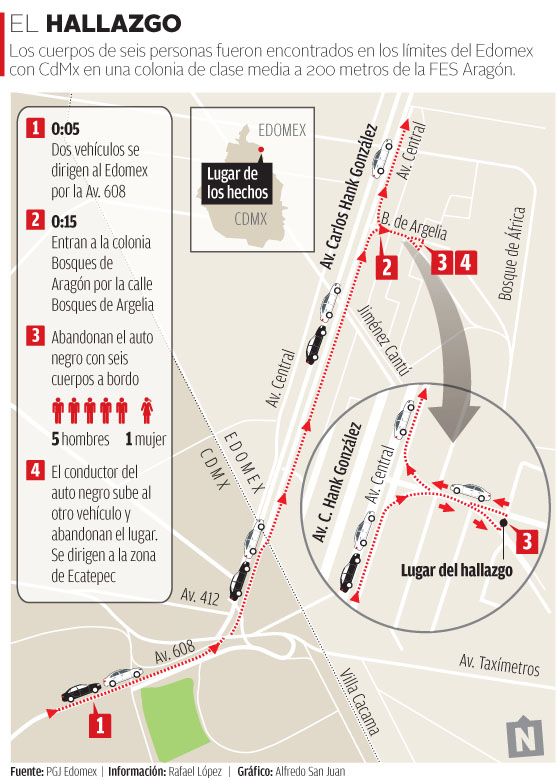 En el Estado de México se confirmó el hallazgo de seis cuerpos en un vehículo abandonado en la colonia Bosques de Aragón, en la zona norte del municipio de Nezahualcóyotl, y de otros dos en Ecatepec.