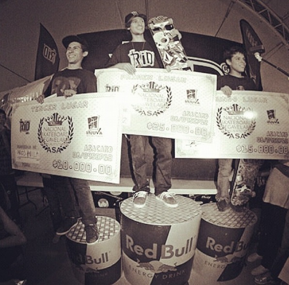 Mario Sáenz (centro)en premiación de un concurso de skateboarding