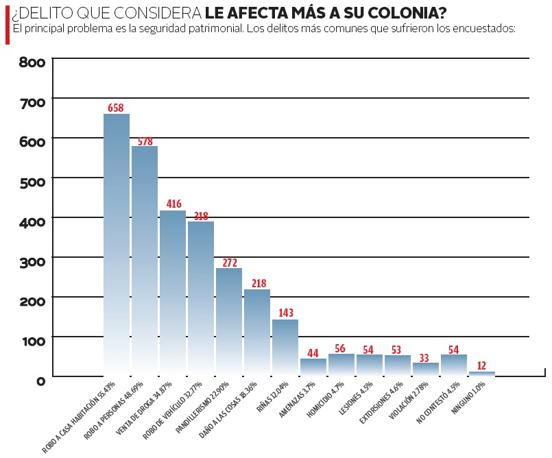 La principal situación de inseguridad es la falta de espacios públicos seguros con 46 por ciento, misma cifra ocupa el grafiti, la falta de alumbrado público significa el 45 por ciento, en tercera posición esta la falta de espacios públicos con 29 por ciento, en el último punto están los temas relacionados con mascotas, con un total de 8 por ciento.