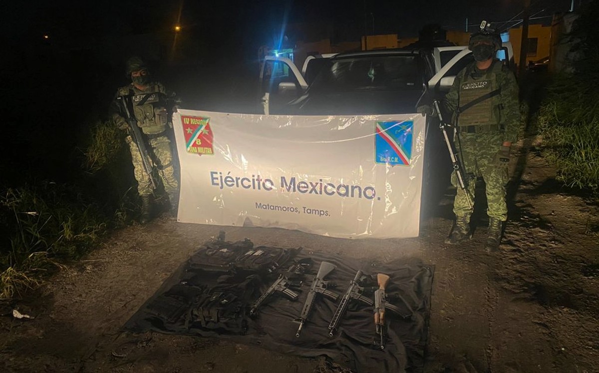 La madrugada de este domingo, personal del Ejército aseguró en una brecha de Matamoros, cuatro armas largas, cargadores y cartuchos, así como una camioneta.